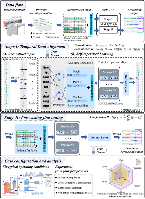 近日,中國科學(xué)院合肥物質(zhì)科學(xué)研究院團(tuán)隊(duì)提出了核電站運(yùn)行參數(shù)預(yù)測大模型框架NPPGPT。在無需顯式提示詞工程的情況下,NPP-GPT框架能夠預(yù)訓(xùn)練大語言模型應(yīng)用于核電站運(yùn)行參數(shù)預(yù)測。該框架采用兩階段跨模態(tài)遷移學(xué)習(xí)策略。第一階段通過輸入嵌入重構(gòu)與基于隨機(jī)遮蔽的自監(jiān)督“重構(gòu)式”學(xué)習(xí),實(shí)現(xiàn)數(shù)值時(shí)序與預(yù)訓(xùn)練語言模型表征空間的對(duì)齊;第二階段采用參數(shù)高效微調(diào),將領(lǐng)域知識(shí)注入GPT-2模型自注意力模塊的Q/V投影,在保持預(yù)訓(xùn)練通用能力的同時(shí)提升對(duì)核電運(yùn)行數(shù)據(jù)的預(yù)測性能,能夠兼顧訓(xùn)練與部署效率。